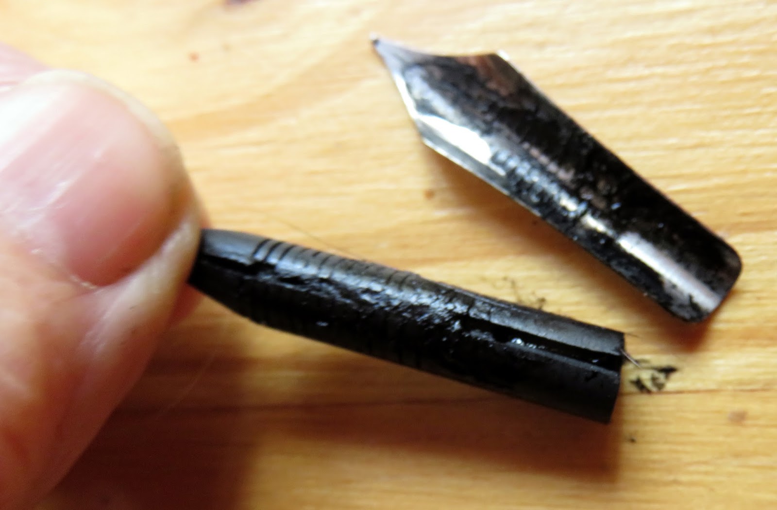 I recently bought another Noodler's Konrad pen, which holds more ink than the Creaper, and was amazed when it quit working after a few weeks. I'm not, any more. That's its feed and nib, on the left, in the first picture below. The other is my normally dependable, foolproof Hero M-86 nib.